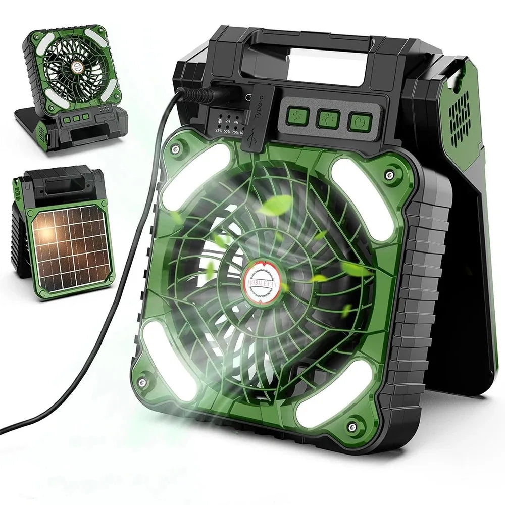 Charge from the sunlight as fast as possible. Only 8 hours is taken to become fully charged via a high efficiency solar panel. Great design for outdoor travel, camping trip, power outage, hurricane ect. Additionally, 10000mAh camping fan allows you to charged by 5V2A usb outlet.